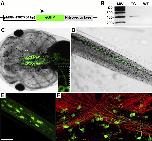Figure 1. Structure and expression of the pMBP-eGFP-NTR transgene. A, Schematic diagram of the pMBP-eGFP-NTR construct. The transgene contains the eGFP open reading frame fused to that of E. coli NTR placed under the control of the DNA regulatory sequence of the murine MBP gene (-1907 bp and +36 bp). B, RT-PCR performed on RNA extracted from brains of transgenic (TG) or wild-type (WT) tadpoles used to amplify a 394 bp fragment corresponding to the junction of eGFP/NTR sequence. CâF, Transgene expression as assessed by GFP fluorescence (CâE) or immunolabeling (F ) in a pMBP-eGFP-NTR transgenic tadpole at stage 55. Dorsal view of the head (C) and sagittal view of the tail (D). Expression is only observed in the CNS (brain and spinal cord) but not in the peripheral nervous system. Inset in C is a higher magnification to illustrate the detection of GFP in the optic nerve. E, In vivo stack of images of the optic nerve obtained by two-photon microscopy. Note the fluorescent processes of the GFP + cells. F, Confocal image of a whole mount of the optic chiasm immunostained for MBP (red) and GFP (green). Note the GFP + cell bodies extending their processes toward the strongly MBP +myelinated fibers. Scale bar (in E) C, D, 2 mm; E, F, 50 um; inset (C), 1 mm.