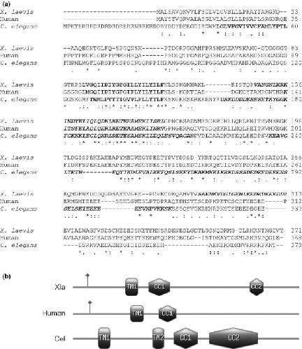 Fig. 1. The predicted amino acid sequence and domain structure of X. laevis RIC-3. (a) Alignment of translated sequences for X. laevis, C. kelegans and human RIC-3 showing first and second transmembrane (TM) regions (bold) predicted by TMPred; and the first (bold, highlighted light grey) and second (bold, highlighted dark grey) coiled-coil (CC) domains predicted by COILS. (b) Schematic representation of the domains found in RIC-3 from the three species.