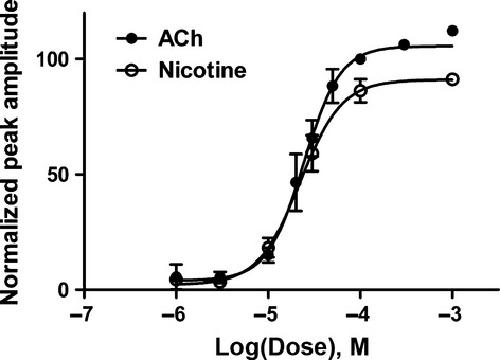 Fig. 2. Concentration-response curves for ACR-16 co-expressed with X. laevis RIC-3. The mean peak current amplitude [normalized to 100 μM acetylcholine (ACh)] was recorded from voltage clamped oocytes 48 h post-injection with 50 ng acr-16/Xenopus ric-3 cRNA at a 1 : 1 ratio (n = 8, n = 4). ACh (closed circles) EC50 = 24 μM (95% CI = 19–30 μM), Hill Slope = 2.177. Nicotine (open circles) EC50 = 22 μM (95% CI = 15–33 μM), Hill Slope = 1.906.