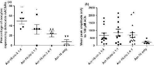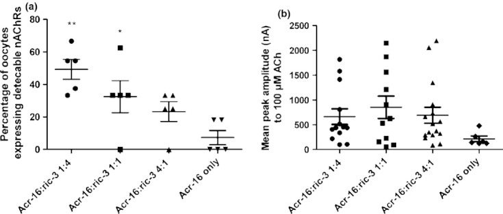 Fig. 3. The effect of varying the amount of X. laevis RIC-3 on the expression of ACR-16 in Xenopus oocytes. (a) The percentage of oocytes expressing detectable currents (> 10nA) in response to 100 μM acetylcholine (ACh) was determined on the experimental weeks in which oocytes from all conditions were screened. The mean percentage expression with the injection of different ratios of acr-16:X. laevis-ric-3 cRNA was as follows; 49 % for 1 : 4, 32 % for 1 : 1, 23 % for 4 : 1 and 7 % for 1 : 0. A One-Way anova with a Tukey's Multiple Comparison Test revealed that the 1 : 4 and 1 : 1 ratio conditions gave significantly more frequent detectable expression than in the 1 : 0 ratio condition (** and * respectively). The 1 : 4 ratio condition was also significantly different to the 4 : 1 condition (*). (b) Mean peak amplitude to 100 μM ACh on ACR-16 expressed in oocytes injected with different ratios of X. laevis ric-3 cRNA to subunit cRNA showing SEM (n = 5, total n for oocytes equal or above 7). Each symbol represents the mean peak amplitude response from a single oocyte on application of 100 μM ACh. The mean results for each condition were as follows; acr-16:X. laevis ric-3 1 : 4 = 662.5 nA, 1 : 1 = 850.7 nA, 1 : 4 = 690 nA, 1 : 0 = 434.4 nA. A one-way anova found that there was no significant difference between the conditions.