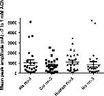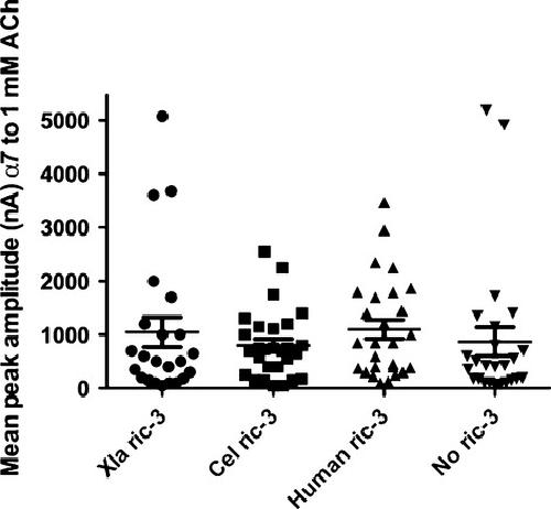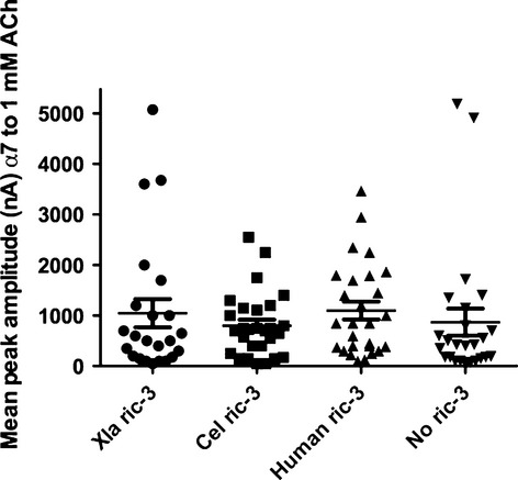 Fig. 5. A comparison of the effects of RIC-3 from Xenopus, human and C. elegans on the expression of human α7. The maximal current evoked by application of 1 mM ACh was measured in the absence of any exogenous RIC-3 and following co-expression with RIC-3 from C. elegans, human or X. laevis at a 1 : 1 ratio. Each data point represents a single oocyte. No significant differences were detected between the experimental conditions.