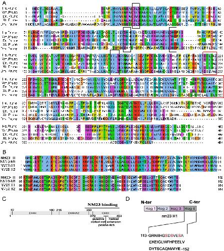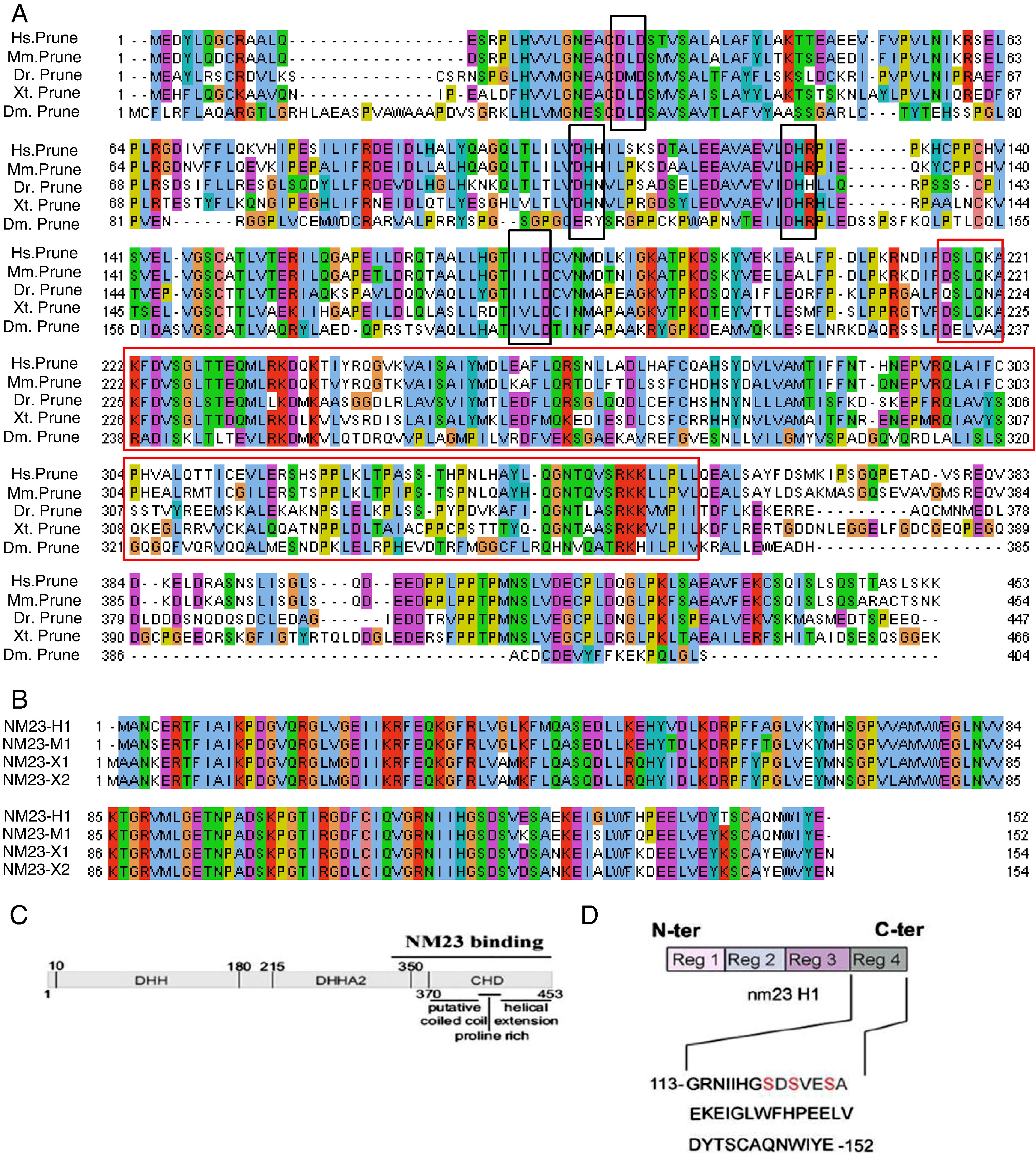 (A) Alignment of amino acid sequences of prune orthologs from human, mouse, zebrafish, Xenopus and Drosophila. Amino acid conservation and the four generic motifs (outlined in black boxes) characteristic of the DHH superfamily are shown. The motif diagnostic of the second group is included in the red box. Numbers indicate the amino acid residues of each protein. (B) Alignment of NM23-1 protein sequences from human (NM23-H1), mouse (NM23-M1) and Xenopus (NM23-X1), and NM23-2 from Xenopus (NM23-X2). (C) Schematic representation of prune and (D) NM23 protein structures highlighting conserved motifs and the respective interacting domains. |