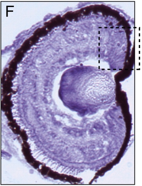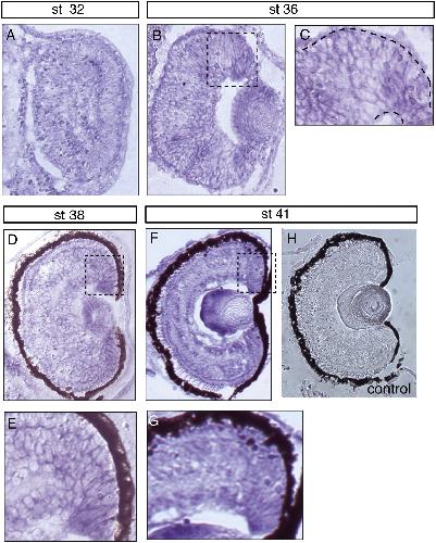 (A) Stage 32; (B) stage 36 and magnification of highlighted area in (C); (D) stage 38 and higher magnification view at (E); (F) stage 41 and highlighted magnification in (G). (H) Control section using sense probe at stage 41. The CMZ area of the retina is highlighted by black dotted squares in (B), (D) and (F) and shown in magnified views in (C), (E) and (G) respectively. |