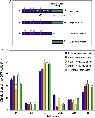 (A) Schematic representation of prune protein structure showing the C-terminal and N-terminal mutants and the substitution of the four aspartate (D) residues. (B) Lipofection results showing percentage of each cell type in the retina using the wild-type human prune construct (h-prune) and the mutants 4Dδm, C-terminal and N-terminal forms compared to the GFP control. Error bars indicate standard error of the mean. N, the number of retinas analyzed. PH, photoreceptor cells; HOR, horizontal cells; BP, bipolar cells; ML, Müller glial cells; AM, amacrine cells; G, retinal Ganglion cells.