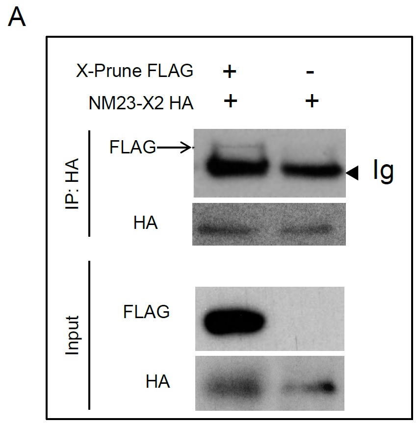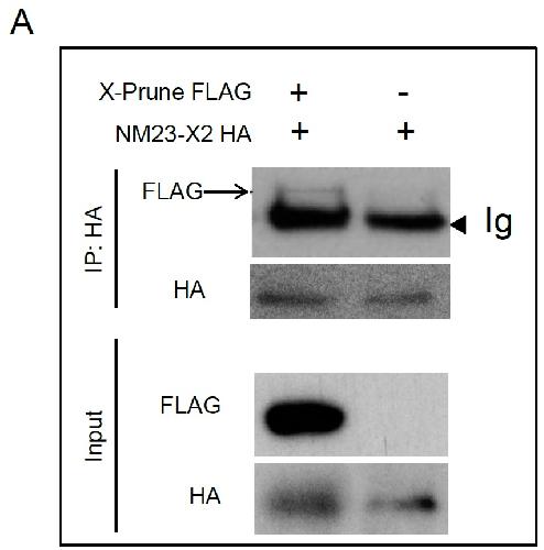(A) Co-IP analyses of the association of NM23-X2 with X-prune in Hek-293 cells cotransfected with X-prune-Flag and NM23-X2-HA. |