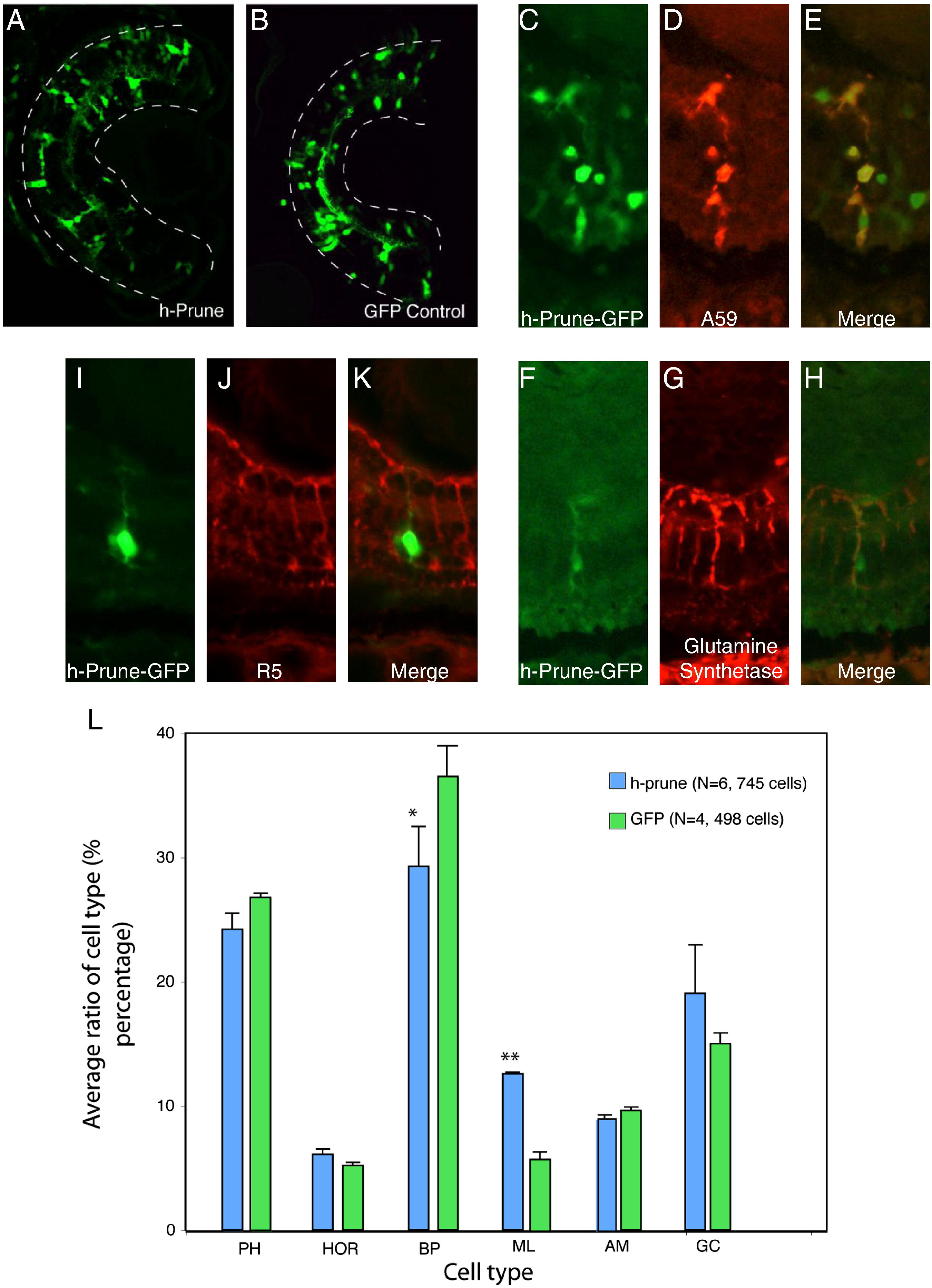 (AâB) H-prune was overexpressed with GFP (green) and then the retina was sectioned at stage 41. Cryosections at stage 41 retinas lipofected with h-prune and GFP (A), or control GFP (B). Dashed lines indicate the outer nuclear layer and inner limiting membrane of retina. (CâE) Cryosection of h-prune and GFP (green, C) co-overexpressed retina was stained with A59 (red, D). Overlaid view (E). GFP positive cells are largely A59 positive. Also, you can observe Müller glial cells at the middle. This indicates that h-prune is indeed overexpressed in the retina. (FâH) H-prune was overexpressed with GFP (green, F). Then the retina was stained by R5 Müller glial cell antibody (red, G). The GFP positive cells are also R5 positive, indicating that the GFP positive cells are Müller glial cells. (IâK) H-prune was overexpressed with GFP (green, I). Then the retina was stained by another Müller glial cell antibody, glutamine synthetase (red, J). The GFP positive cells are also R5 positive, indicating that the GFP positive cells are Müller glial cells. (L) Graphic representation of lipofection results showing percentage of each cell type in the retina using the wild-type human prune construct (h-prune) compared to the GFP control (see text for details). Error bars indicate standard error of the mean; N, the number of retinas analyzed; the asterisks indicate where statistically significant results exist (using Student's T-test compared to the GFP control, as standard methodology), which is: * for p < 0.05, ** and for p < 0.01. PH, photoreceptor cells; HOR, horizontal cells; BP, bipolar cells; ML, Müller glia cells; AM, amacrine cells; GC, ganglion cells. |