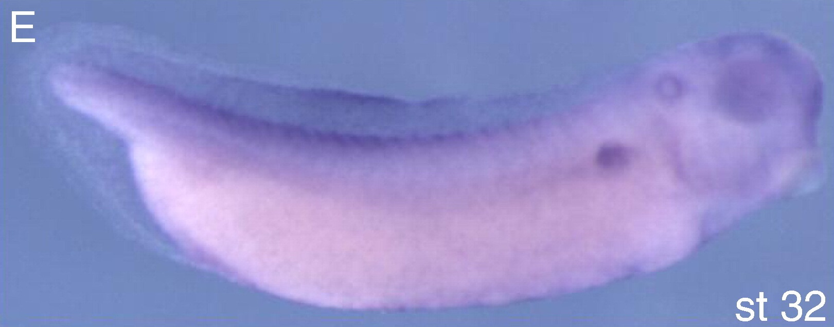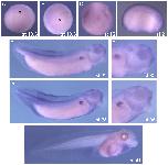 Whole mount in situ hybridization using an anti-sense probe. (A) Stage 10.5, vegetal view, dorsal up; (B) stage 10.5, lateral view, asterisk marks the dorsal lip of blastopore; (C) anterior view, dorsal up; (D) stage 21; (E) stage 32; (F) stage 32, zoom of head region; (G) stage 35; (H) stage 35, zoom of the head; (I) stage 41 tadpole. All views of (DâI) are lateral, anterior to the right. |