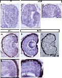 (A) Western blotting with polyclonal antibody raised against the human prune protein (A59) in protein extracts from X. laevis embryos, HEK-293 cells transiently transfected with an expression vector containing Mm-prune cDNA, and mouse total embryos. (B). Whole mount immunofluorescence of Xenopus embryos using A59 antibody raised against prune protein (top panel) or NM23 protein (K73, bottom panel) compared with in situ hybridization using anti-sense prune probe (medium panel). Stages are as indicated (stages 24, 32 and 45). X-prune protein and NM23 largely colocalize during embryogenesis. Indicated with white lines are the eye (e), the otic vesicle (otv), the branchial arches (ba) and the somites (s). |