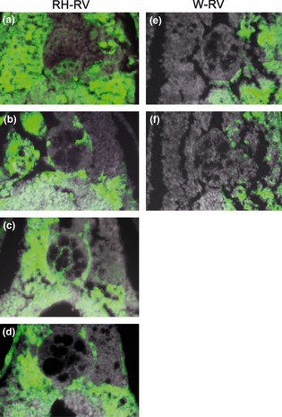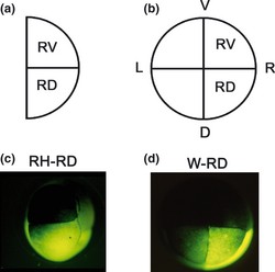 Fig. 1. Nomenclature of the blastomeres and embryos receiving a tracer injection. (a, b) Graphical representation of the animal pole view of a right half (RH) embryo (a) and a normal embryo (b) at the four-cell stage, and the nomenclature of the right blastomeres. (c, d) Animal pole views of a right dorsal blasto- mere-labeled RH embryo (c; RH-RD) and a right dorsal blasto- mere-labeled whole (normal) embryo (d; W-RD) at the eight-cell stage. The orientations are the same in all of the embryos. D, dorsal; L, left; R, right; RD, right dorsal blastomere; RV, right ventral blastomere; V, ventral. |