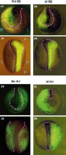 Fig. 2. Representative distributions of the labeled blastomere progeny in the ectoderm of regulated right half (RH) and normal embryos at the late gastrula or early neurula stage. (a, c) A right dorsal blastomere-labeled regulated embryo (RH-RD) at stage (St.) 13. (b, d) A right dorsal blastomere-labeled whole (normal) embryo (W-RD) at St. 15. (e, g) A right ventral blastomere-labeled regulated embryo (RH-RV) at St. 15 and 14. (f, h) A right ventral blastomere-labeled whole embryo (W-RV) at St. 18 and 17. The dashed lines indicate the margin of the neural plate or the top of the neural fold. Embryos are viewed from the anterior (a, b, e, f) and dorsal (c, d, g, h) sides. A, anterior; L, left; P, posterior; R, right. |