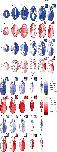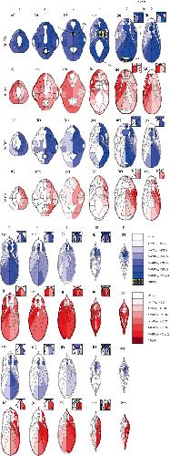 Fig. 5. Averaged distribution maps of the blastomere clones in regulated and normal tailbud larvae. The gradation in blue or red indi- cates the population percentage of the RD or RV clone (the right upper corner of the figure). The numbers on the upper line indicate the analyzed section levels (Fig. 3). The rectangles in the upper right corner of the panels, at levels 5�10, show the magnified tissues around the hypochord. The abbreviations at the left end of the panel lines and the orientations of the embryos in the panels are the same as in Figures 1, 2, and 4, respectively. ha, heart anlage; hm, head mesenchyme; hy, hypochord; l, liver; n, notochord; p, pronephric anlage; s, somite. |