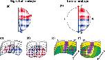 Fig. 7. The putative prospective midlines and distribution of the right blastomere clones on the gastrocoel roof in RH embryos and normal embryos. The densities of the blue and red dots represent the cell-percentages of the RD and RV clones. The left and right half of the panels in the two panel lines show an RH embryo (a) or a regulated RH embryo (c, d), and normal embryos (b, e, f), respectively. (a, b) Animal views of the four-cell stage embryos. The prospective dorsal and ventral midlines are represented with the blue and red arrowheads. (c�f) The gastrocoel roof at stage 15, cut transversely into anterior (c, e) and posterior (d, f) parts. Prospective tissues in the fate maps (Shook et al. 2004; permission from Elsevier) were colored only in normal embryo (e, f): the gastrocoel roof plate (GRP) con- sists of the prospective regions for the ventral part of the notochord (magenta), the hypochord (gray), and the medial ventral cells of the somites (yellow). The lateral endodermal crests (LECs) (yellow green) that derived from the supra-blastoporal endoderm and the endo- derm that originated from the sub-blastoporal region (green) serially flank the GRP. At later stage, the prospective hypochord segments fuse in the ventral position to the notochord (Fig. 5, rectangles), and LECs form the most dorsal regions in the yolky endoderm on both sides. A, anterior; D, dorsal; L, left; P, posterior; R, right; V, ventral. |