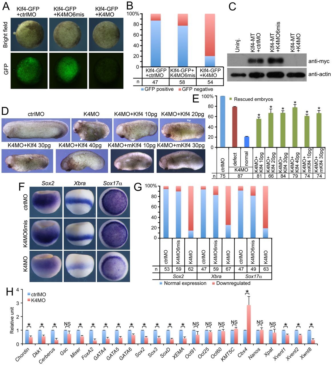 Fig. 3. Loss-of-function analyses on Klf4. (A) Effect of ctrlMO, K4MO6mis or K4MO on the translation of co-injected mRNA for Klf4-GFP in embryos. Embryos were observed at stage 11 under brightfield or green fluorescent protein (GFP) and photos were taken using the same exposure parameters. (B) Quantification of embryos without (GFP-negative) or with (GFP-positive) green fluorescence. (C) Effect of ctrlMO, K4MO6mis and K4MO on the translation of Klf4-MT using western blotting (WB). Uninjected (Uninj.) and injected embryos were collected at stage 10.5 for WB. A myc-tag (MT) antibody (anti-myc) was used to detect the Klf4-MT fusion protein. α-Actin was used as a loading control. In A and C, each MO was injected at 10 ng, Klf4-GFP or Klf4-MT mRNA was injected at 400 pg. (D) The rescuing effect of injected Xenopus Klf4 mRNA (Klf4) or mouse Klf4 (mKlf4) mRNA on the Klf4 morphant. MOs were injected at 10 ng each. The dose of mRNA was indicated at the top of each panel. (E) Quantification of normal, Klf4 morphant and rescued embryos in D. Error bars represent s.d. in three experiments. Student's t-test was used to compare the ratio of rescued embryos against the ratio of unaffected embryos among K4MO-injected embryos. The asterisks indicate P<0.01. (F) Effect of injection of ctrlMO, K4MO6mis and K4MO on expression of Sox2, Xbra and Sox17α. Embryos for Sox2 expression were orientated to a dorsolateral view; those for Xbra to a lateral view, and Sox17α to a vegetal view. (G) Statistical numbers of embryos in three experiments with normal or downregulated gene expression in F. (H) Gene expression analysis with qPCR. In F and H, 20 ng of ctrlMO or K4MO was injected into the equatorial region of all blastomeres at the four-cell stage and collected at gastrulation for whole-mount in situ hybridization or qPCR. Error bars represent s.d. in triplicate. A Student's t-test was used to compare the change in gene expression between ctrlMO- and K4MO-injected embryos. Asterisks indicate P<0.01. NS: not significant. |