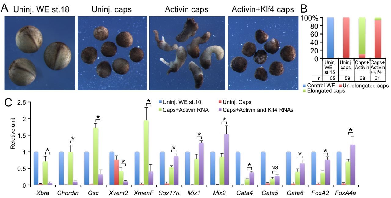 Fig. 5. Influence of Klf4 overexpression on tissue differentiation induced by Activin. (A) Activin βB mRNA (0.2 pg) was injected alone or together with 300 pg of Klf4 mRNA into the animal pole of all blastomeres of two-cell or four-cell embryos. At stage 8.5, animal caps were removed from uninjected or injected embryos and cultured until the neurula stage. (B) Quantification of embryos and caps in A. (C) Gene expression analysis with qPCR on the caps described in A, but collected at stage 10. Error bars represent s.d. in three experiments. Asterisks indicate P<0.01. NS: not significant. |