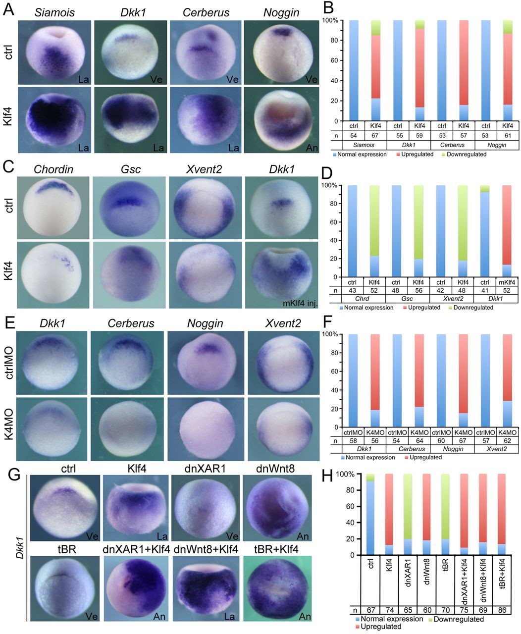 Fig. 8. The effect of Klf4 on anteriorization signals. (A) The effect of Klf4 injection (Klf4) on Siamois, Dkk1, Cerberus and Noggin transcription. (B) Quantification of embryos with normal or altered expression in A in three experiments. (C) The effect of Klf4 mRNA injection (Klf4) or mouse Klf4 (mKlf4) injection on Chordin, Gsc, Xvent2 and Dkk1. All embryos are in vegetal view except the mKlf4-injected one (mKlf4), which is in lateral view to show ectopic Dkk1 transcription. (D) Quantification of embryos with normal or altered expression in C in triplicate. For experiments in A and C, Klf4 or mKlf4 mRNAs were injected at 300 pg into all blastomeres at the four-cell stage. Embryos were collected at stage 10.5 for whole-mount in situ hybridization except that embryos at stage 8.5 were collected for detecting Siamois. (E) Dkk1, Cerberus, Noggin and Xvent2 expression in response to K4MO injection. Embryos were in vegetal view. ctrlMO and K4MO were injected at 20 ng and embryos were collected at stage 10.5 for whole-mount in situ hybridization. (F) Quantification of embryos with normal or altered expression in E in triplicate. (G) The effect of injecting Klf4 (at 300 pg), dnXAR1 (1.5 ng), dnWnt8 (1 ng) or tBR mRNA (1 ng) alone or in combination on Dkk1 expression, as indicated above each panel. Embryos were collected at stage 10.5 for whole-mount in situ hybridization. (H) Quantification of embryos with normal or altered expression in G in triplicate. An: Animal view; La: lateral view; Ve: vegetal view. |