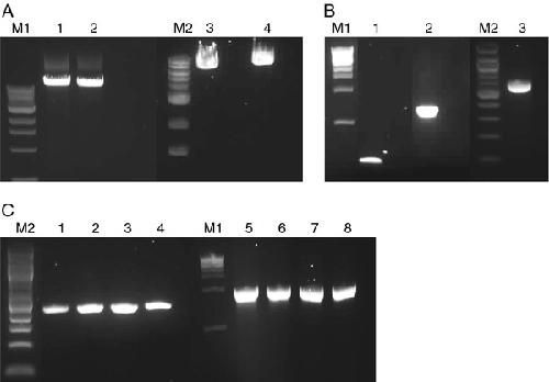 Figure 1. Long PCR, COX1, 16S, primer region 1 and primer region 2 amplicons. Agarose gel electrophoresis of (A) Xenopus borealis (XB; lanes 1 and 2) and X. victorianus (XV; lanes 3 and 4) PCR fragments using Long F1/R2 (lanes 1 and 3) and Long F2/R1 primers (lanes 2 and 4). (B) XB (lanes 1 and 2) and XV (lane 3) PCR fragments using COX1 (lane 1) and 16SA-Lmod/H (lanes 2 and 3) primers. (C) XB (lanes 1-2 and 5-6) and XV (lanes 3-4 and 7-8) PCR fragments using AMP1F/R (lanes 1-4) and AMP2F/R (lanes 5-8) primers. M1 and M2â=â1kb and 100bp DNA ladders, respectively.