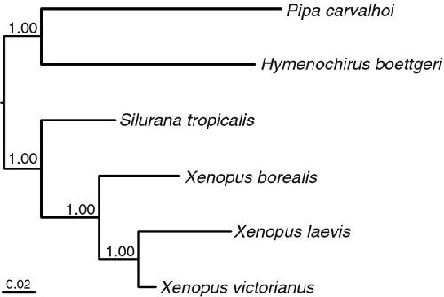 Figure 3. Phylogenetic estimates of the interrelationship of four xenopus species and two relatives based on Bayesian analysis of amino acids from concatenated protein coding sequences. Nodal support is given by posterior probabilities; branch-length scale indicates number of substitutions per site.