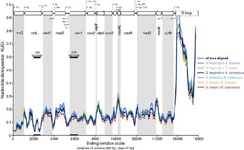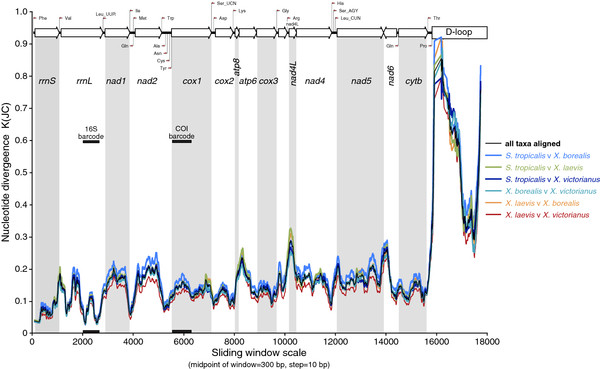 Figure 4. Sliding window analysis of complete mitochondrial genome sequences of xenopus frogs. The coloured lines show the value of nucleotide divergence K(JC) (average number of nucleotide substitutions per site between species with Jukes and Canor correction) in a sliding window analysis of window size 300 bp with step size 10 for: all four xenopus (black), ST v XL (green), ST v XB (light blue), ST v XV (dark blue), XL v XB (orange), XB v XV (turquoise) and XL and XV (red). Gene boundaries and primers and regions commonly used in DNA barcoding amphibians are indicated.