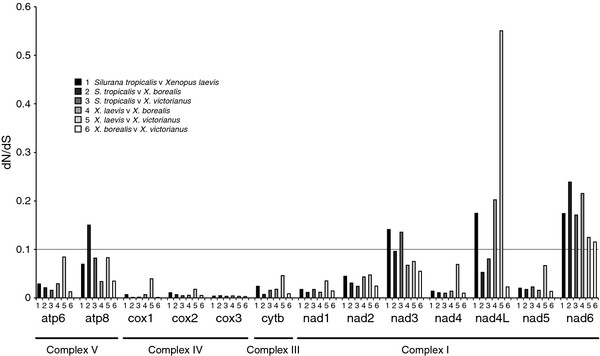 Figure 5. Ratios of nonsynonymous/synonymous (dN/dS) nucleotide substitutions between the protein-coding genes of xenopus mitochondrial genomes. Although the ratios differ considerably between genes, complexes and pairs of species, in all cases genes are evolving under negative (purifying) selective pressure (dN/dS < 1).