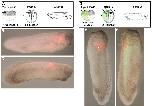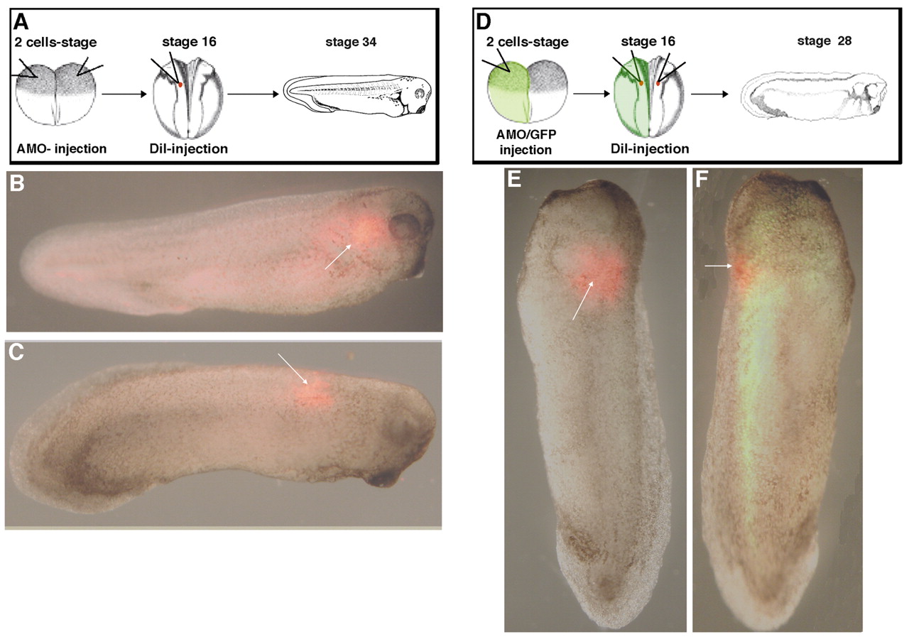 Figure 5. AMO-injected embryos show inhibition of DiI-labeled neural crest migration. Both blastomeres of two-cell stage embryos were injected with AMO, allowed to develop to stage 16, and then injected with the lipophilic dye DiI into the dorsal neural folds in the area of the hindbrain, containing presumptive cranial neural crest cells (A). Upon reaching stage 34, the embryos were examined under a fluorescent stereoscope. (B) In control embryos injected only with DiI, fluorescent cells are observed around the branchial arches (arrow), a target for cranial neural crest cells (in 44/51=86% of embryos). By contrast, in AMO-injected embryos (C), DiI-labeled crest cells remain in the dorsal aspect of the neural tube (arrow; in 31/43=72% of embryos; n=3). In a different set of experiments (D), a single blastomere of two-cell stage embryos was injected with AMO along with GFP RNA, used as a lineage tracer. Embryos were allowed to develop to stage 16 and were then injected with DiI on both the right and left sides of the dorsal neural folds, in the same area of the hindbrain as in A. Upon reaching stage 28, embryos were examined under a fluorescent stereoscope. On the untreated side (E), streams of cells (arrow) migrating from the site of injection ventrally, towards the branchial arches, are observed (in 68/68=100% of embryos). On the AMO/GFP-treated side (F), DiI-labeled cells are observed above the neural tube (arrow), and no fluorescence is detected in or around the branchial arches (in 49/68=72% of embryos; n=3). |