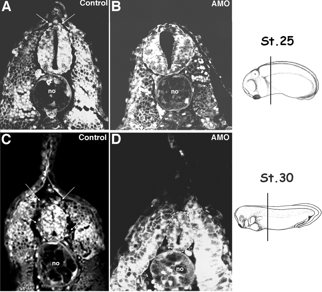 Fig. 6. Inhibition of neural crest migration in AMO-injected embryos is independent of neural tube closure. Two-cell stage embryos injected in both blastomeres with a low concentration (6.5 ng/blastomere) of AMO (B,D) were analyzed by confocal microscopy for neural crest cell migration and neural tube closure, when compared with uninjected controls (A,C). In stage 25 control embryos, neural crest cells (arrows) can be observed above the neural tube (A), but are completely absent in AMO-injected embryos (B). By stage 30, in control embryos (C), migrating neural crest cells move ventrally around the neural tube, as well as into the dorsal fin. In sibling, AMO-injected embryos (D), no migrating neural crest cells are detected. Note the completely sealed neural tube in the AMO-injected embryos; the neural tube is outlined in white. no, notochord. |