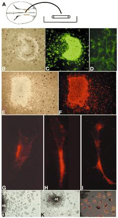 Fig. 7. Vg1 RBP is asymmetrically localized in explanted neural crest cells and required for their migration. Stage 20-22 embryos were cut horizontally in the middle of the embryo, and a caudal piece of trunk neural tube (indicated schematically by red lines in A) containing premigratory neural crest cells was placed in a petri dish coated with fibronectin. Twenty-four hours of incubation at 25°C led to an emigration of up to several hundred cells, with several different morphologies. Generally, the tubes rolled onto their sides, leading to an asymmetric outgrowth of the neural crest on one side of the explanted tube. (B) Phase-contrast image; (C) the fluorescence micrograph of an explanted neural tube stained with the anti-HNK1 antibody. (D) Emigrating neural crest cells and neural fibers stain positive for HNK1. (E,F) Explanted neural tube and outgrowing cells were stained with anti-Vg1 RBP antibody and viewed using phase-contrast (E) or fluorescence (F) microscopy. For both the anti-HNK1 and anti-Vg1 RBP antibodies, note the fluorescence in the neural tube and in the majority of the cells that have migrated out of the tube. (Melanophores, because of their pigment, do not show noticeable fluorescence.) (G-I) Representative patterns of asymmetric distribution of Vg1 RBP in migratory neural crest cells. Vg1 RBP is observed at different sites in neural crest cells, including along the membrane (G), and in processes that generally point away from the explanted tissue (H,I). (J-L) Injection of AMO reduces the migration of neural crest cells in explants. Neural tubes from stage 20-22 embryos, injected with either CMO (J) or AMO (K), were cultured as described in A. The number of cells that migrate out of the explant from AMO-injected embryos (K) was reduced approximately threefold when compared with that from CMO-injected embryos (J). Immunostaining of the AMO-injected explants shows that these migrating cells are positive for Vg1 RBP (L). Note the presence of differentiated neural crest derivatives in the explant cultures, suggesting that both the cells and the tube remained viable during the course of the assay. |