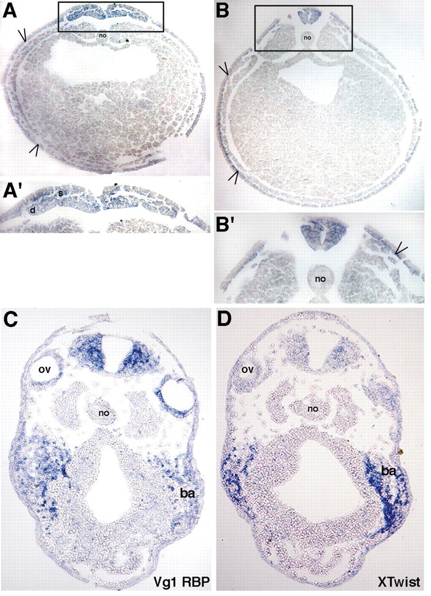 Fig. 1. Vg1 RBP mRNA distribution in embryos. Digoxygenin-labeled probes were used to perform in situ hybridization on embryos or sections at different developmental stages. Embryos subjected to whole-mount in situ hybridization (A,Aâ²,B,Bâ²) were embedded in paraffin wax, and transverse sections were analyzed for Vg1 RBP mRNA expression. (A,Aâ²) Vg1 RBP transcripts are detected throughout the neural plate in stage 17 embryos, including the lateral deep (d) layer that contains the prospective neural crest cells and the superficial (s) layer, containing the prospective roof plate cells. In addition, the sensorial layer of the epidermal ectoderm is clearly positive for Vg1 RBP (open arrowheads). (B,Bâ²) A mid-trunk section of a stage 21 embryo shows that Vg1 RBP mRNA is uniformly expressed throughout the closed neural tube. The sensorial layer of the ectoderm remains strongly labeled (open arrowheads). (C,D) Comparison of Vg1 RBP and Xtwist expression on adjacent sections of a tailbud stage embryo at the cranial levels. (C) Vg1 RBP transcripts are detected in the roof plate and throughout the neural tube. In addition, the otic vesicles (ov) and branchial arches (ba) are clearly positive for Vg1 RBP. (D) A similar pattern of expression is observed in sections probed for Xtwist RNA. no, notochord. |