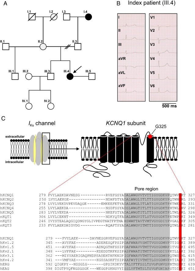Identification of the KCNQ1 G325R mutation. (A) Pedigree of the LQTS1 family analyzed in this study (arrow indicates the index patient). Closed symbols denote patients exhibiting QT prolongation, open symbols indicate unaffected family members. Circles refer to women, squares indicate men. (B) Resting ECG of the index patient (III.4; QTc, 452 ms). (C) Schematic representation of a heteromeric IKs channel (left), comprising four KCNQ1 α‐subunits (gray) and the maximum occupancy of four KCNE1 β‐subunits (yellow) ( Bokil et al., 2010, Nakajo et al., 2010 and Wang et al., 2011). The membrane folding model (right) of a single KCNQ1 subunit indicates the location of the mutated amino acid residue, G325. Conservation of residue G325 is demonstrated by amino acid sequence alignments of pore helix, potassium selectivity filter and S5-/S6-linker for human (h) KCNQ family potassium channels KCNQ1-5, Caenorhabditis elegans (n) KCNQ homologs KQT1-3, and human voltage gated potassium (Kv) channels. The respective GenBank accession numbers are AF000571, NM_172107, NM_004519, NM_004700, NM_019842 for KCNQ1-5; NM_171709, NM_076991, NM_064474 for KQT1-3; and NM_004974 (hKv1.2; KCNA2), NM_002234 (hKv1.5; KCNA5), NM_004975 (hKv2.1; KCNB1), NM_004976 (hKv3.1; KCNC1), NM_012281 (hKv4.2; KCND2), NM_000238 (hERG; KCNH2), AF078741 (hEAG; KCNH1), respectively. Amino acids forming the channel pore are highlighted by gray color, and G325 and its homologs are boxed and highlighted in red.