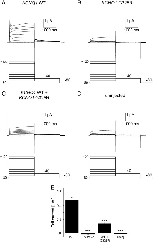 K+ currents induced by expression of KCNQ1 α-subunits in Xenopus oocytes. Representative current traces recorded from cells expressing WT KCNQ1 (A) or KCNQ1 G325R (B) channels are shown. (C) Currents induced by co-expression of equal amounts of WT KCNQ1 and KCNQ1 G325R subunits. (D) Currents recorded from a non-injected control cell. (E) Mean peak tail current amplitudes (n = 24 cells per column; ***p < 0.001 compared to WT KCNQ1).