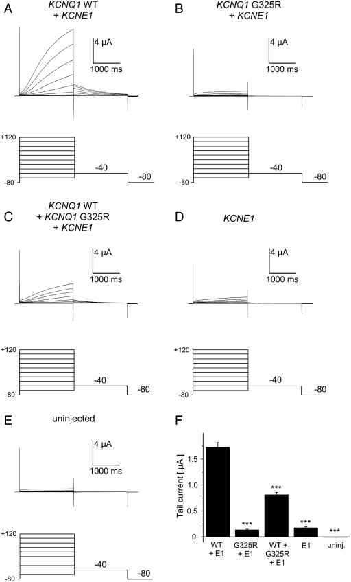 Analysis of IKs currents. IKs was generated by co-expression of WT KCNQ1 (A) or KCNQ1 G325R (B) in combination with KCNE1 cRNA. (C) IKs currents resulting from co-expression of KCNE1 with equal amounts of WT KCNQ1 and KCNQ1 G325R subunits. (D) Currents induced by expression of KCNE1 β-subunits. (E) Currents recorded from a non-injected control cell. (F) Mean peak tail current amplitudes (n = 36 cells per column; ***p < 0.001 compared to WT KCNQ1 + KCNE1).