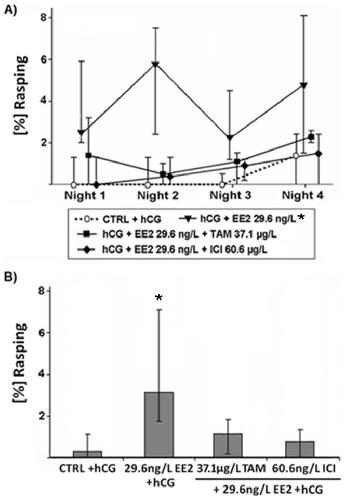 Figure 2. Effects of various EDC on proportions of the call type rasping produced by male Xenopus laevis.Median (IQR) (n = 10 per treatment) of (A) percentages of rasping calls in each of the four recorded nights and (B) median percentages of rasping calls produced by male Xenopus laevis exposed to 17α-ethinylestradiol (EE2), a mixture of EE2 and tamoxifen (EE2+TAM) or EE2 and fulvestrant (EE2+ICI). Statistical differences were determined using General Linear Mixed models. Significant differences from solvent control (CTRL) + human chorionic gonadotropin (hCG) treatment are marked by asterisks (* p≤0.05; ** p≤0.01; *** p≤0.001).