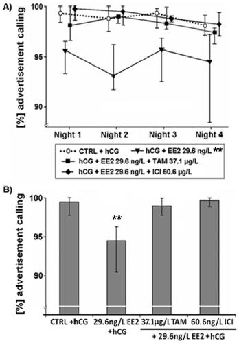 Figure 1. Effects of various EDC on proportions of advertisement calls produced by male Xenopus laevis.Median (IQR) (n = 10 per treatment) of (A) percentages of advertisement calls in each of the four recorded nights and (B) median percentages of advertisement calls produced by male Xenopus laevis exposed to 17α-ethinylestradiol (EE2), a mixture of EE2 and tamoxifen (EE2+TAM) or EE2 and fulvestrant (EE2+ICI). Statistical differences were determined using General Linear Mixed models. Significant differences from solvent control (CTRL) + human chorionic gonadotropin (hCG) treatment are marked by asterisks (* p≤0.05; ** p≤0.01; *** p≤0.001).