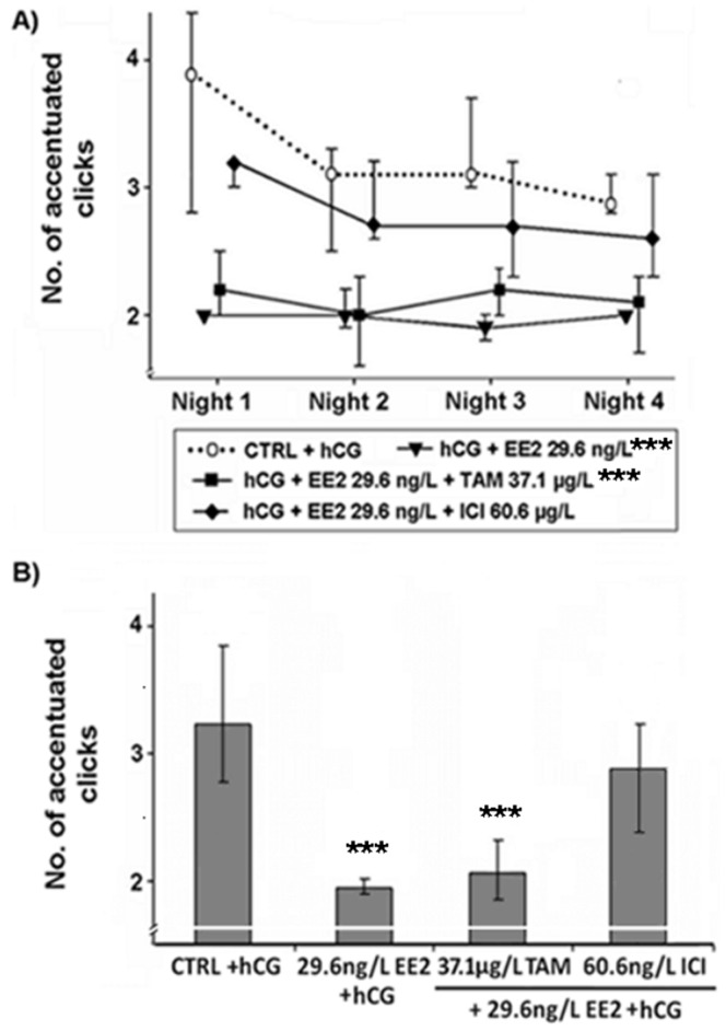 Figure 3. Effects of various EDC on the number of accentuated clicks within advertisement calls produced by male Xenopus laevis.Median (IQR) (n = 10 per treatment) of (A) the number of accentuated clicks in each of the four recorded nights and (B) the median number of accentuated clicks produced by male Xenopus laevis exposed to 17α-ethinylestradiol (EE2), a mixture of EE2 and tamoxifen (EE2+TAM) or EE2 and fulvestrant (EE2+ICI). Statistical differences were determined using General Linear Mixed models. Significant differences from solvent control (CTRL) + human chorionic gonadotropin (hCG) treatment are marked by asterisks (* p≤0.05; ** p≤0.01; *** p≤0.001).