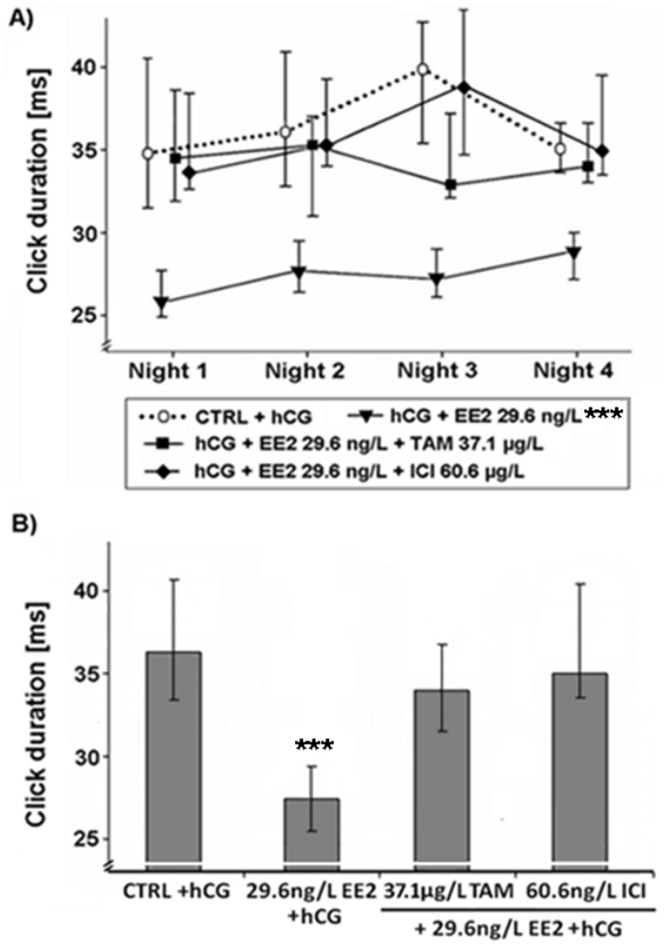 Figure 4. Effects of various EDC on the duration of clicks within advertisement calls produced by male Xenopus laevis.Median (IQR) (n = 10 per treatment) of (A) the duration of clicks of male advertisement calls in each of the four recorded nights and (B) the median duration of clicks of male advertisement calls produced by male Xenopus laevis exposed to 17α-ethinylestradiol (EE2) or a mixture of EE2 and tamoxifen (EE2+TAM) or EE2 and fulvestrant (EE2+ICI). Statistical differences were determined using General Linear Mixed models. Significant differences from solvent control (CTRL) + human chorionic gonadotropin (hCG) treatment are marked by asterisks (* p≤0.05; ** p≤0.01; *** p≤0.001).