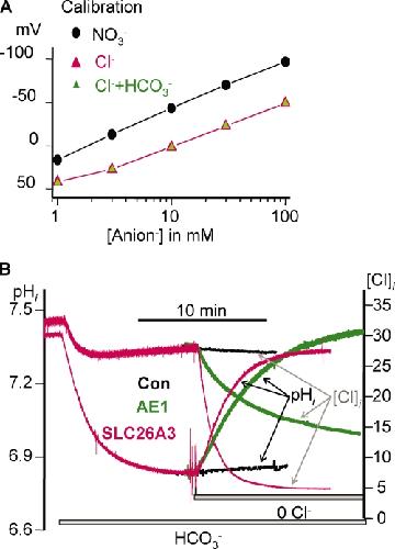 Figure 1. Stoichiometry of Cl−/HCO3− exchange by slc26a3. (A) An example of a calibration of the Cl− electrode and that the resin is not sensitive to 90 mM HCO3− (green triangles) and is more selective for NO3− (black circles) than Cl− (red triangles). In B, control Xenopus oocytes (black traces) and an oocyte expressing AE1 (green traces) or slc26a3 (red traces) were bathed in HCO3−-buffered media, and, after the stabilization of pHi, they were incubated in Cl−-free media. The initial rates of pHi and Cli− changes were used to calculate the fluxes and the Cl−/HCO3− stoichiometry that are listed in Table 1. For simplicity, the changes in pHi and Cli− caused by exposure to CO2/HCO3− are shown only for the oocyte expressing slc26a3. In this and all other experiments, the traces shown are from representative experiments, and the number of experiments and means are given in the text.