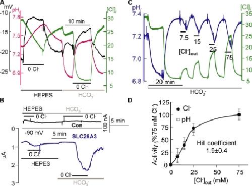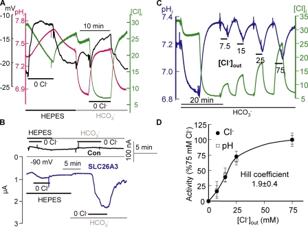 Figure 2. Coupling of Cl− and HCO3− transport by slc26a3. In A, an oocyte expressing slc26a3 was exposed to Cl−-free medium while incubated in HEPES-buffered and HCO3−-buffered media. Red trace, pHi; green trace, Cli−; black trace, membrane potential. In B, current generated by Cli−/OHo− and Cli−/HCO3o− exchange was measured in a control oocyte (black trace) and an oocyte expressing slc26a3 (blue trace) while holding the membrane potential at −90 mV. In C, an oocyte expressing slc26a3 and incubated in HCO3−-buffered media was exposed to Cl−-free medium at 10 min and was then exposed to different Clo− between 7.5 and 75 mM, as indicated by the bars, while measuring pHi (blue trace) or Cli− (green trace). The rates of pHi (squares) and Cli− (circles) changes from three experiments are summarized in D. Error bars represent SEM.