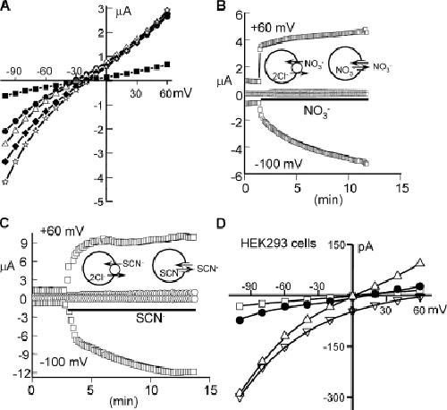 Figure 4. NO3− and SCN− current by slc26a3. Xenopus oocytes expressing slc26a3 and bathed in HEPES-buffered media (A–C) were incubated in media in which Clo− was replaced with NO3− (A and B) or SCN− (C) while measuring the I-V relationship (A) or the current (B and C) at a holding membrane potential of −30 mV and sampling every 10 s by stepping to −100 and 60 mV for 50 ms. In A, the oocyte was incubated in Cl−-containing media (squares) or NO3−-containing media for 1 (circles), 3 (triangles), 5 (diamonds), or 10 min (stars). B and C show the current measured in control (circles) and slc26a3 (squares)-expressing oocytes. The models in B and C show the possible modes of transport at the beginning and end of the incubation period with NO3− and SCN−. (D) The I-V relationship in an HEK293 cell transfected with GFP (squares) or with GFP and slc26a3 and dialyzed with NO3i− and incubated in Na+-free medium in which the major anion was NO3− (squares and triangles), gluconate (inverted triangles), or Cl− (circles). The traces in A–D are from single experiments, and the means and number of experiments are given in the text.