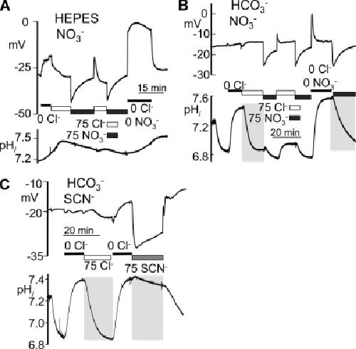 Figure 5. Uncoupled NO3− and SCN− fluxes by slc26a3. Xenopus oocytes expressing slc26a3 were bathed in HEPES-buffered (A) or HCO3−-buffered media (B and C). As indicated by the solid bars, they were exposed to Cl−-free media, and, after the stabilization of pHi, the rates of Cl−/HCO3− and NO3−/HCO3− exchange (B) or Cl−/HCO3− and SCN−/HCO3− exchange (C) were compared, as marked by the gray areas. In each panel, the changes in membrane potential are shown in the top trace, and the changes in pHi are shown in the bottom trace. Note the slow NO3−/HCO3− exchange and the very slow SCN−/HCO3− exchange. The number of experiments and means are given in the text.