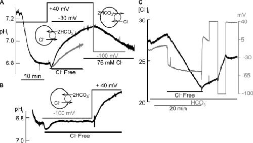 Figure 7. Effect of the membrane potential on HCO3− and Cl− transport by slc26a6. A Xenopus oocyte expressing slc26a6 was bathed in HCO3−-buffered media. (A) After the stabilization of pHi, the membrane potential was clamped at −30 (gray trace) or 40 mV (black trace) before exposing the oocyte to Cl−-free medium. Where indicated, Clo− was restored, and, after an additional 5 min, the membrane potential was switched from 40 to −100 mV (gray period). (B) After stabilization of the pHi of the oocyte incubated in HCO3−-buffered media, the membrane potential was clamped at −100 mV, and the oocyte was exposed to Cl−-free medium (gray period). Where indicated by the black period, the membrane potential was switched to 40 mV. The models depict the mode of exchange measured at each period. (C) After the stabilization of Cli− (black trace), the oocyte was incubated in Cl−-free medium without holding the membrane potential was then incubated in the presence of Clo− while holding the membrane potential at 40 or −100 mV as indicated. Note the initiation of Cl− influx into the oocytes by holding the membrane potential at −100 mV. Each experiment is representative of at least three others with similar results.