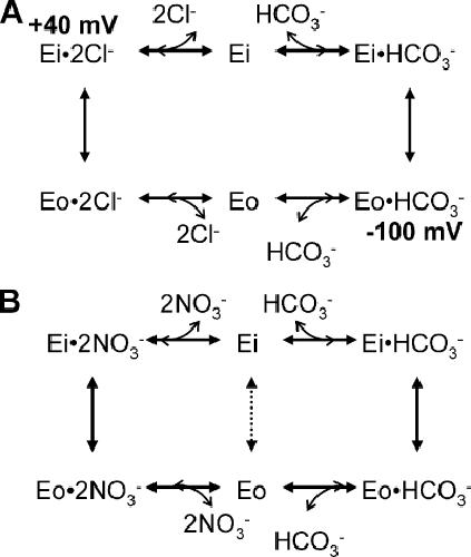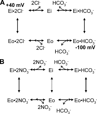 Figure 9. Models of coupled and uncoupled anion transport by slc26a3. (A) A model of the turnover cycle of coupled 2Cl−/1HCO3− exchange by slc26a3. (B) A model for the turnover cycles of uncoupled NO3− and SCN− transport by slc26a3.