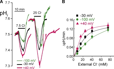 Figure 3. Effect of the membrane potential on HCO3− transport by slc26a3. The protocol shown in Fig. 2 C was used to measure changes in pHi except that the changes in pHi at each Clo− concentration were measured while holding the membrane potential alternately at −30, −100, and 40 mV. The membrane potential was clamped after the stabilization of Cli− and for 30 s before and during the duration of the subsequent measurement of Cl−/HCO3− exchange. No more that three Cl− concentrations were tested in each oocyte to minimize error caused by the deterioration of the signal. (A) Example traces from the same oocyte exposed to 7.5 and 25 mM Clo− while holding the membrane potential at −30 (black traces), −100 (green traces), or 40 mV (red traces). Results from at least three measurements at each Cl− concentration and at the indicated membrane potentials, similar to those in Fig. 3 A, are plotted in B and show the Clo−-dependence of HCO3− transport at −30 (squares), −100 (circles), and 40 mV (triangles). Error bars represent SEM.