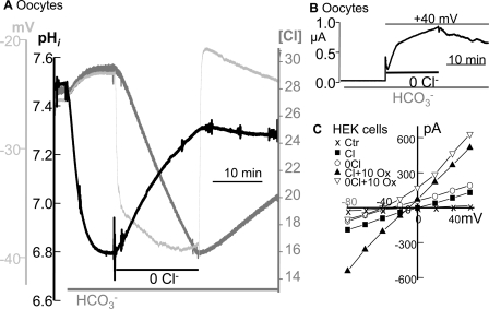 Figure 6. Stoichiometry of Cl−/HCO3− exchange by slc26a6. (A) Xenopus oocyte expressing slc26a6 and bathed in HCO3−-buffered media was incubated in Cl−-free and Cl−-containing medium as indicated. The rates of HCO3− (heavy black trace) and Cl− (heavy gray trace) transport initiated by the removal of Clo− were used to calculate the Cl−/HCO3− transport stoichiometry of slc26a6, and the results of multiple experiments are given in Table 1. The light gray trace shows the change in membrane potential. (B) The current was measured in an oocyte expressing slc26a6 and bathed in HCO3−-buffered media. Where indicated, the membrane potential was clamped at 40 mV, and the effect of Cl− removal and readdition on the current was measured. (C) The HEK293 cell expressing slc26a6 was dialyzed with Na+-free pipette solution containing 150 mM Cli− and bathed in Na+-free solutions containing 150 mM Cl− (squares), gluconate (circles), Cl− and 10 mM oxalate (triangles), or gluconate and oxalate (inverted triangles), and the I-V relationship was determined between −80 and 60 mV. The number of experiments and means are given in the text.