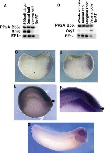 Fig. 1. Expression pattern of PP2A:B56ϵ during early embryonic development of Xenopus. (A,B) Expression of PP2A:B56ϵ in the early blastula. (A) PP2A:B56ϵ expression along the dorsal-ventral axis: 500-cell stage embryos were dissected into dorsal and ventral halves. RNA was prepared from each half. Expression of PP2A:B56ϵ was analyzed by RT-PCR. EF1α was used as loading control. Xnr6 (dorsally restricted expression) was used as a control for accurate dissection. (B) PP2A:B56ϵ expression along the animal-vegetal axis: 500-cell stage embryos were dissected into animal, marginal zone, and vegetal pieces. RNA was prepared from each and expression of PP2A:B56ϵ was analyzed by RT-PCR. VegT (vegetal pole restricted expression) was used as a control for accurate dissection. (C-F) PP2A:B56ϵ expression as determined by in situ hybridization of hemisections. (C) PP2A:B56ϵ expression in the dorsal marginal zone of an early gastrula stage (stage 10) embryo. (D. Expression in marginal zone of a midgastrula (stage 11) embryo; (E) expression in neural ectoderm of a midneurula stage (stage 15) embryo. (F) Higher magnification of E showing PP2A:B56ϵ expression in the anterior neural ectoderm. (G) PP2A:B56ϵ expression in a stage 33 tadpole. Arrows in E and F indicate the anterior edge of PP2A:B56ϵ expression domain in the neural ectoderm.