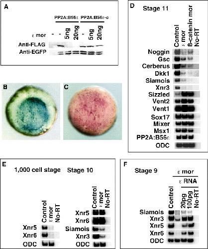 Fig. 2. Maternal PP2A:B56ϵ is required for dorsal development. (A) Morpholino antisense oligonucleotide directed against PP2A:B56ϵ blocks the translation of flag-tagged PP2A:B56ϵ RNA, but not flag-tagged PP2A:B56ϵ-c, in Xenopus oocytes, as determined by western blotting. EGFP mRNA was coinjected and western blotted with anti-GFP as a control. (B) Vegetal view of an uninjected host-transfer embryo at the onset of gastrulation (stage 10+), showing formation of the dorsal lip of the blastopore. (C) Vegetal view of a maternal PP2A:B56ϵ-depleted embryo also at stage 10+, showing absence of dorsal lip. (D) RT-PCR showing the gene expression profile in maternal PP2A:B56ϵ and β-catenin-depleted embryos at midgastrula stage (stage 11). (E) RT-PCR showing reduced expression of Xnr5 and Xnr6 at the 1,000-cell stage and reduced expression of siamois and Xnr3 at gastrula stage (stage 10). (F) RT-PCR showing reduction of dorsal gene expression in maternal PP2A:B56ϵ-depleted embryos could be rescued by PP2A:B56ϵ-c mRNA.