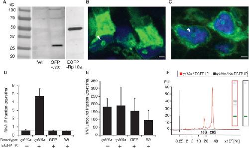 Figure 2. EGFP-Rpl10a protein localizes properly and can be used to selectively enrich for RNAs. A: Western analysis of whole eye lysates from transgenic tadpoles expressing cytoplasmic GFP (GFP-cyto) and EGFP-Rpl10a, both under control of the same islet2b regulatory sequence, and from wildtype control tadpoles (Wt) show transgene protein products of the expected size. B: Representative image shows a 2D projection of a series of optical sections (Z-stack) showing nucleolar and inner segment localization of the EGFP-Rpl10a protein in rods. C: Representative image shows a 2D projection of a Z-stack showing nucleolar and cytoplasmic localization of the transgenic EGFP-Rpl10a protein in RGCs. Arrowheads in B and C point to nucleoli. D: RNA recovery from unconjugated beads (â) or EGFP-coated beads (+) using lysates of Tg(isl2b:EGFP-Rpl10a) (L10a), Tg(isl2b:GFP) (GFP-cyto), and from non-transgenic wildtype (Wt) retinas, show significant RNA recovery only in Tg(isl2b:EGFP-Rpl10a) lysates in the presence of the EGFP antibody. Grey horizontal line shows the 0.5-ng limit of detection of the bioanalyzer. E: The residual unbound RNA fraction from the samples shown in D was comparable in all samples. Data in D and E represent the mean RNA levels from 12 retinas averaged for three replicates, and statistical significance between individual samples was established by pair-wise ANOVA comparisons (***P < 0.001). F: Representative superimposed electropherogram traces from TRAP EGFP-rpl10a transgenic samples affinity purified with EGFP conjugated beads (red trace) and unconjugated beads (black trace) show high abundance 18S and 28S ribosomal RNAs and lower abundance mRNAs only in EGFP-rpl10a samples extracted using EGFP- conjugated beads. Right insets show corresponding RNA gels for each of the traces. Scale bars = 2 μm.Download figure to PowerPoint