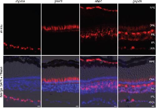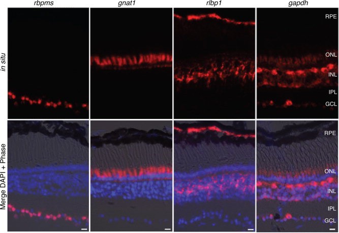 Figure 3. In situ hybridization shows expression patterns of a subset of the genes used to assess cell-type enrichment by TRAP. Representative images of retina sections from wildtype stage 57 tadpoles show mRNA expression patterns for genes selectively expressed in RGCs, rods, and Müller cells (rbpms, gnat1, rlpb1, respectively) and a gene expressed widely in multiple cell types (gapdh). A composite image of the in situs (shown in top row), DAPI and brightfield is used to identify cell layers (Merge DAPI + Phase; 2nd row). RPE, retinal pigment epithelium; ONL/INL, outer and inner nuclear layers; IPL, inner plexiform layer; GCL, ganglion cell layer. Scale bar = 20 μm.Download figure to PowerPoint