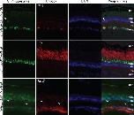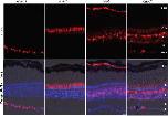 Figure 1. X. laevis lines have specific expression of EGFP-Rpl10a in rods or RGCs. Representative images show GFP fluorescence of the EGFP-rpl10a transgene in retinal sections of stage 57 F1 progeny (green; left column) from lines expressing the EGFP-rpl10a cDNA under the control of zebrafish islet2b (isl2b), X. laevis rhodopsin (rho), or X. tropicalis fatty acid binding protein 7 (fabp7) upstream regulatory sequences. Immunostaining using cell typeâspecific antibodies (red; second column) specific for RGCs (Sncg), rods (Rho), and Müller cells (Fabp7) confirms cell type-specificity of the Tg(rho:EGFP-rpl10a) and Tg(isl2b:EGFP-rpl10a) lines but not Tg(fabp7:EGFP-rpl10a) line. DAPI shows the nuclear cell layers (blue; 3rd column) while a composite image of the GFP fluorescence, antibody, DAPI and brightfield identifies any overlap between endogenous GFP fluorescence and immunostaining (Merge + Phase; 4th column). Arrowheads point to a presumed displaced RGC. Arrows point to Müller cell processes. RPE, retinal pigment epithelium; ONL/INL, outer and inner nuclear layers; IPL, inner plexiform layer; GCL, ganglion cell layer. Scale bar = 20 μm.Download figure to PowerPoint