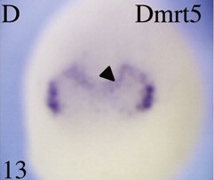 dmrta2 (DMRT-like family A2) gene expression in Xenopus laevis embryo, assayed via in situ hybridization, NF stage 17, anterior view, dorsal up.