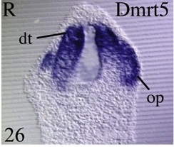 dmrta2 ((DMRT-like family A2) gene expression in Xenopus laevis embryo, assayed via in situ hybridization, NF stage 26, transverse section through the head at optic vesicle level, dorsal up.