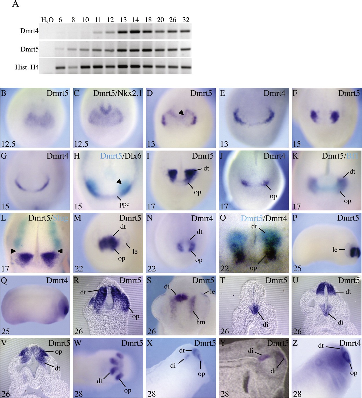 Fig. 2. Dmrt5 temporal and spatial expression pattern. (A) Temporal expression of Dmrt5 by RT-PCR. RNA was extracted from embryos at the indicated stages. Histone H4 was used as a loading control. (B)Z) Spatial expression pattern of Dmrt5 compared to that of Dmrt4 analysed by whole-mount in situ hybridization. Unless indicated, all embryos are shown in anterior views. Nieuwkoopaber stages are indicated. (B) Initial expression of Dmrt5 is observed at stage12.5 in a horse-shoe shaped area in the anterior region of the neurectoderm. (C) Embryo at the stage as in (A) double stained with NBT-BCIP for Dmrt5 and Nkx2.1 showing that Dmrt5 and Nkx2.1 do not overlap. (D)G) At stage 135, both Dmrt5 and Dmrt4 genes are detected bilateraly at the anterior neural plate border, the Dmrt5 staining region being broader and extending less medially than the Dmrt4 stained area. Weak Dmrt5 expression is also detected at stage 13 in a stripe bordering the posterior side of the initial horse-shoe shaped stained zone (arrowhead). (H) Stage 15 embryo double stained with Dlx6 (dark blue) and Dmrt5 (light blue) showing that Dmrt5 is expressed in a subdomain of the preplacodal ectoderm and that its expression extends to the adjacent neural plate (arrowhead). (I)L) Single (I) and (J) and double (K) and (L) in situ hybridization showing that at stage 17, Dmrt5, but not Dmrt4, is coexpressed with BF-1 in the developping dorsal telencephalon. Note also that Dmrt5 staining is detected anterior to the domain of expression of the neural crest Slug marker. Arrowheads indicate posterior and anterior boundaries of Dmrt5 and Slug, respectively. (M) and (Z) Relationship between the Dmrt5 and Dmrt4 genes at stages 228, as revealed by single (M)Q), (W)Z) and double in situ hybridization (O). (P), (Q), (X) and (Z) lateral and (W) dorsal views, anterior to the right. A high magnification view of the anterior head fold of a Dmrt5 and Dmrt4 double stained embryo is shown in panel O, with Dmrt5 in light blue and Dmrt4 in dark blue. (R)T) Transverse sections of an embryo through the olfactory epithelium and dorsal telencephalon (R), the anterior (S) or posterior (T) diencephalon. (U) and (V) Horizontal sections though the dorsal telencephalon and diencephalon (U) or through the olfactory placodes and dorsal telencephalon (V). (Y) Sagittal section. Note Dmrt5 strong expression in the dorsal telencephalon, olfactory placodes and diencephalon and weak expression in the prospective lens ectoderm and in the mesenchyme surrounding the eyes. Abbreviations: dt, dorsal telencephalon; hm, head mesenchyme; le, lens ectoderm; di, diencephalon; op, olfactory placodes; ppe, preplacodal ectoderm. |
